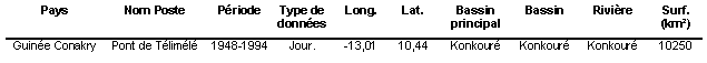 Les débits caractéristiques du Konkouré, DCC, DC3 et DC6 ont été affectés par une rupture de leur moyenne en 1965 pour le DCC et en 1969 pour les DC3 et DC6. Les déficits enregistrés sont d’un même ordre de grandeur, 30 à 40%.