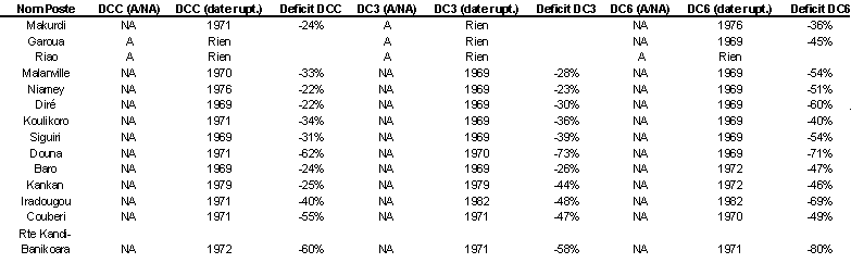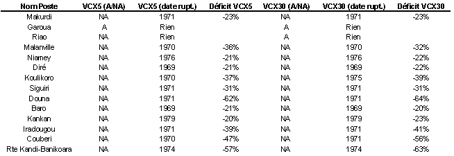 Les résultats obtenus sur les DCC et DC3 confirment les observations précédentes : une rupture s’observe sur le bassin du Niger (mais pas sur la tête du bassin de la Bénoué) autour de la période 1969-1971.