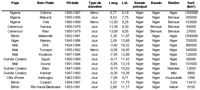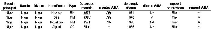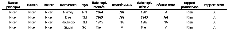 Il faut s’attarder sur la station de MALANVILLE qui n’a pas été traitée statistiquement. A cet endroit, le Niger reçoit des apports des cours d’eau tropicaux du Bénin dont la crue arrive très décalée par rapport à celle du cours supérieur. L’hydrogramme de crue présente alors 2 pointes. Depuis le début de la décennie 1970, la première pointe de crue (celle du cours supérieur) est très atténuée. Certaines années, elle n’apparaît même parfois plus et se fond dans la courbe de montée de crue qui ne présente alors plus qu’un maximum correspondant à la crue des eaux provenant du Bénin.