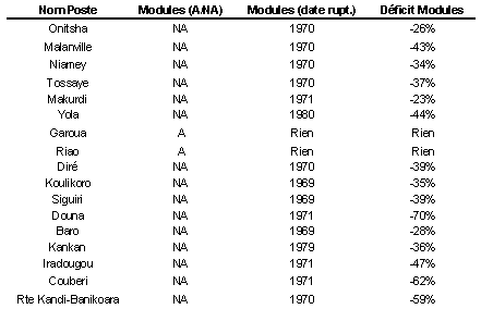 Dans la région de MALANVILLE, les écoulements du Niger connaissent une diminution plus importante (43%) que l’on peut lier à une très forte diminution des apports des affluents d’origine tropicale issus du Sud (59%), zone à déficit pluviométrique, lui même, important.