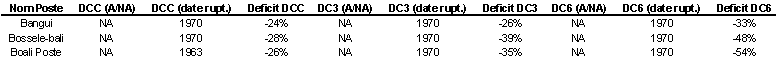 Comme on pouvait le pressentir d’après les observations faites sur les modules et les hautes-eaux , les DC6 ont plus fortement diminué que les DC3 et les DCC. Les moyennes-eaux ont été particulièrement touchées par le déficit pluviométrique enregistrée dans la région. Les dates de rupture sont 1963 pour les DCC à BOALI (comme pour les hautes-eaux) et 1970 pour les autres débits caractéristiques et stations.