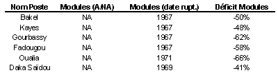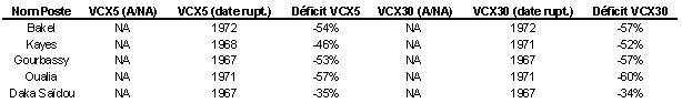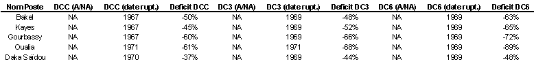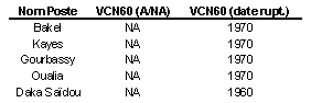 Sur les DC3 et les DC6 l'occurence du phénomène se situe entre 1969 et 1971. Cette période de variation est commune à celle identifiée sur les DCC de OUALIA et de DAKA SAÏDOU. En revanche l'analyse des DCC de GOURBASSY, KAYES et BAKEL révèle une légère antériorité, en 1967.